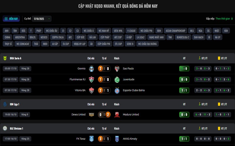 Chuyên mục được thiết kế khoa học, dễ nhìn, với giao diện thân thiện giúp người dùng dễ dàng tìm kiếm theo giải đấu, quốc gia hoặc thời gian thi đấu. Mỗi khi trận đấu kết thúc, hệ thống tự động cập nhật tỷ số chỉ sau vài phút, đảm bảo người xem luôn có được thông tin nhanh nhất và chính xác nhất.