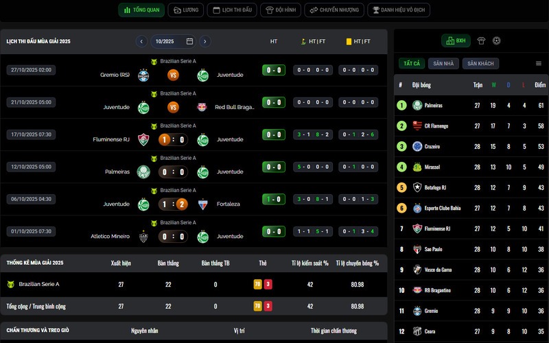 Vì vậy, sau mỗi vòng đấu, anh em thường truy cập vào đây để để xem kết quả và bảng điểm mới nhất. Tại đây, mọi thông tin như tỷ số, cầu thủ ghi bàn, kiến tạo, thẻ phạt hay thống kê sút bóng đều được hiển thị đầy đủ và chính xác tuyệt đối.
