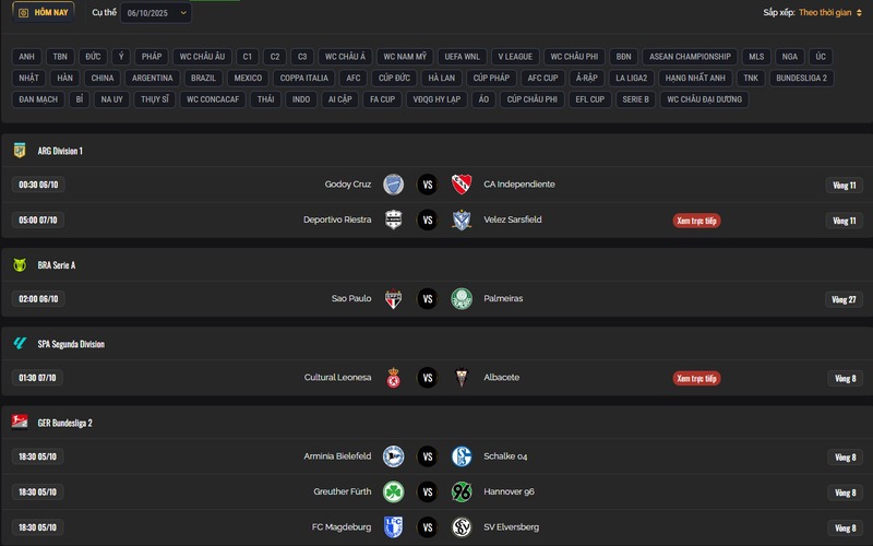 • Lịch bóng đá được chia nhỏ theo từng ngày, như “hôm nay”, “ngày mai”, hay “tuần tới”, giúp bạn nhanh chóng tìm đúng mốc thời gian mình quan tâm.